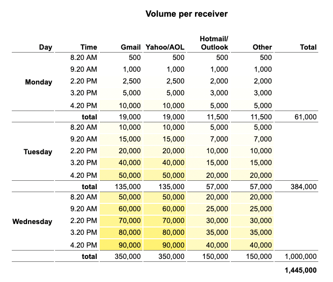 - To prevent annoying any major receivers, you'll also want to analyze the full list for its percentage of recipients by receiver: That’s Gmail, Yahoo/AOL (they use the same mail servers), and Hotmail/Outlook (they also use the same mail servers, small world!) During each batched send, ensure there's a population of each receiver represented.