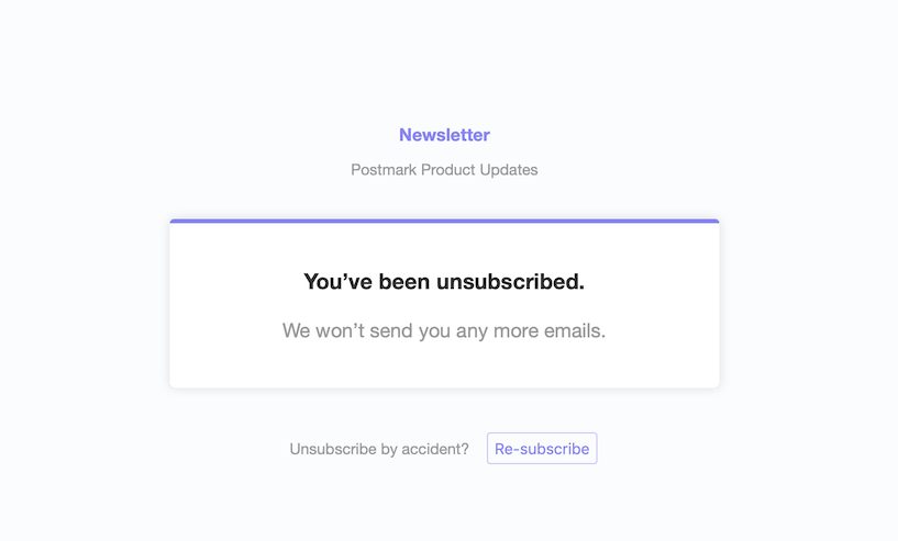 By default, Postmark handles the entire unsubscribe flow for your Broadcast emails: lists, landing pages, headers, and links. But if you already have your own systems in place, you can manage unsubscribes yourself. Just keep in mind that this means you're responsible for including the required list-unsubscribe headers and staying compliant with inbox provider requirements from Gmail, Yahoo, and others.
