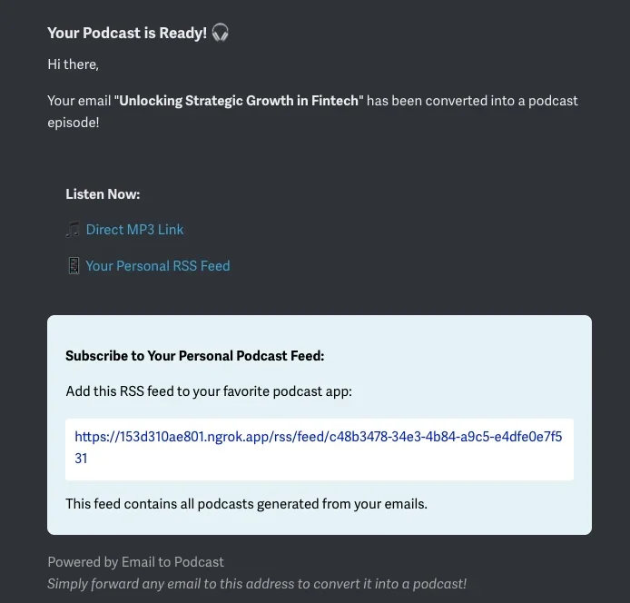 Email to Podcast brilliantly solves a modern content creation challenge. Send any text content via email, and the system automatically: