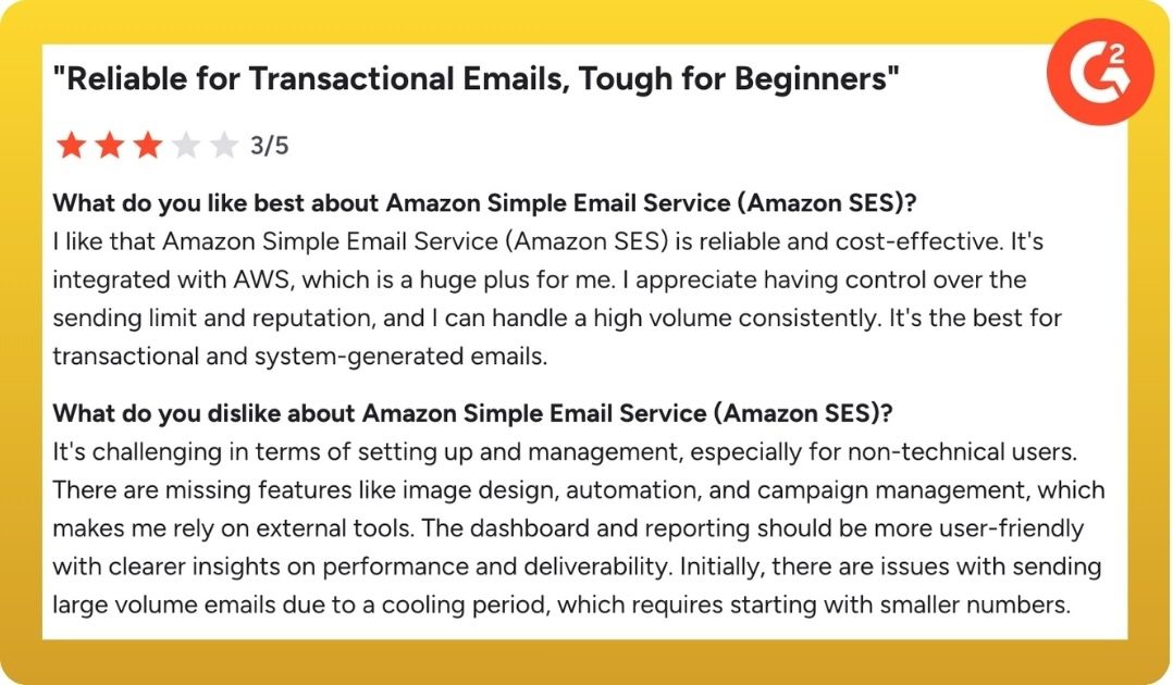 - No deliverability insights: Amazon SES doesnât tell you what you want to know about deliverability, making it hard to know whether or not your transactional emails made it to the inbox. That makes troubleshooting deliverability issues tricky.