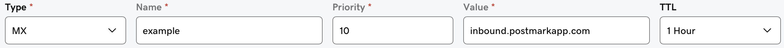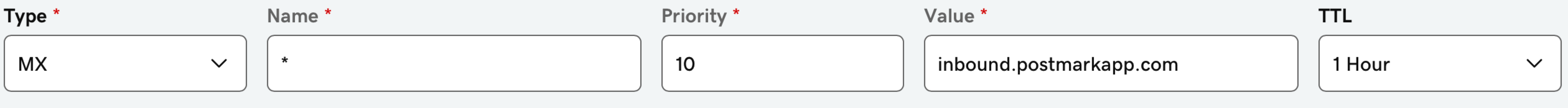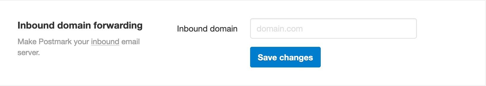 Choose a domain that you would like to listen on for incoming email to be processed by Postmark. In your DNS configuration, create an MX record that points to inbound.postmarkapp.com and give it a value of 10.