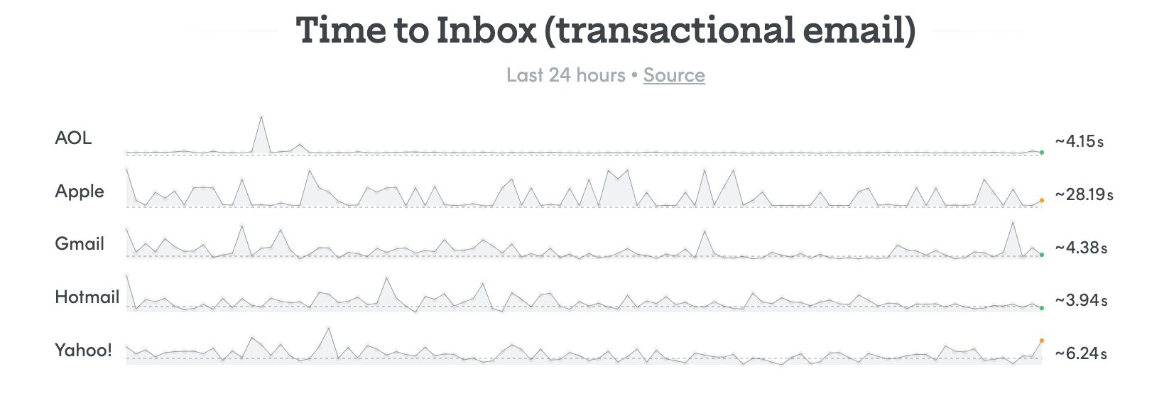 - Look for information about delivery speeds and rates. For instance, at Postmark, we constantly test and share the results for our 3rd-party-monitored inbox rates and delivery speeds for the top five inbox providers—AOL, Apple, Gmail, Hotmail, and Yahoo—right on our public status page. We also run our own tests on delivery times and include this with the delivery rates. This is the same data that we use to monitor our systems and react to any potential performance or delivery issues.