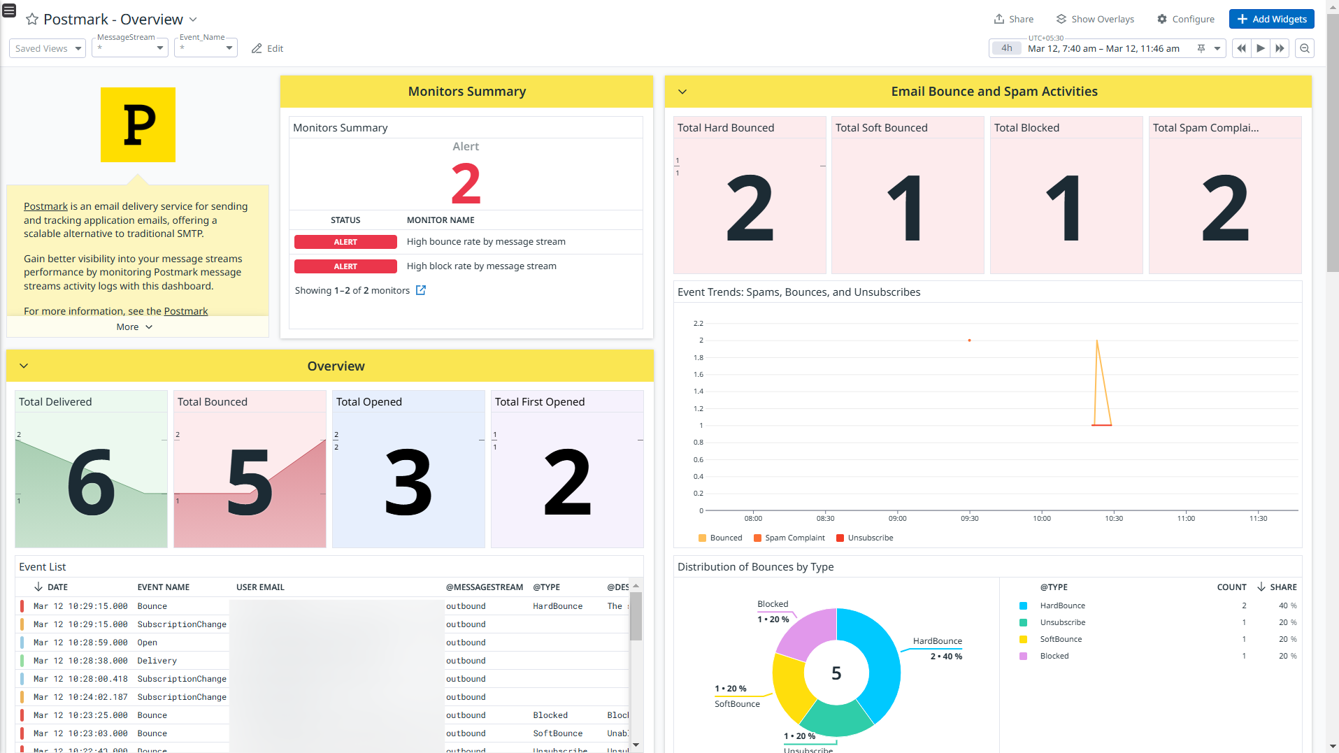 Monitor email performance alongside other tools in one place! Here's an example of Postmark data in Datadog: