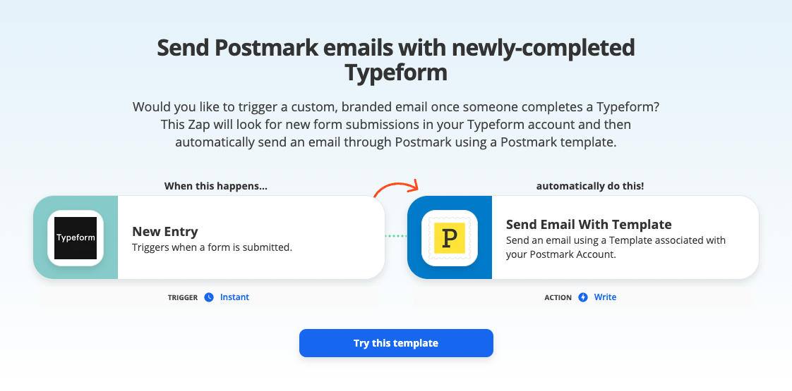 With our Zapier integration for Postmark, it’s easy to trigger an email as soon as someone fills out a Typeform. Whether you’d like to send a simple confirmation or a coupon code as a thank you for filling out a survey, trigger a newsletter welcome email, or provide additional information to follow up on an event registration, you can do all of this and more with Postmark and Zapier.