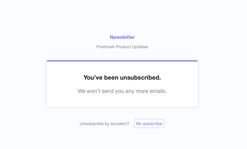 If a recipient unsubscribes from your messages, Postmark will unsubscribe their email address from your Message Stream and redirect them to a page letting them know the unsubscribe was successful. The address will then be listed in the Suppressions for your Stream. After unsubscribing, there is an option for recipients to re-subscribe: