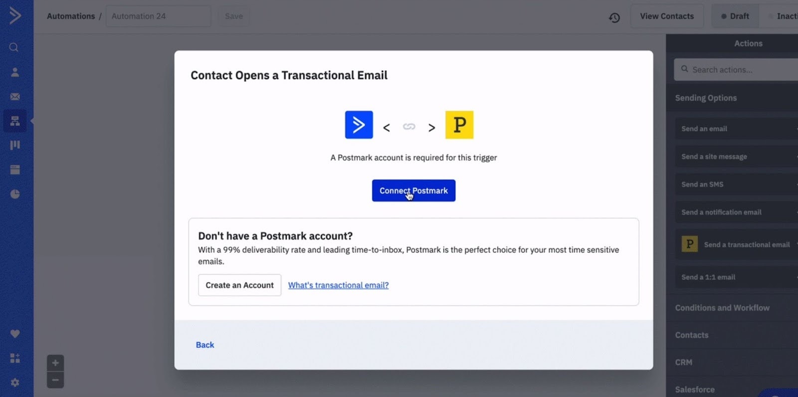 â ď¸ To use the Opens/Reads email trigger, a Postmark account is required. If you have not opened a Postmark account yet, click the Create an Account button to create one.