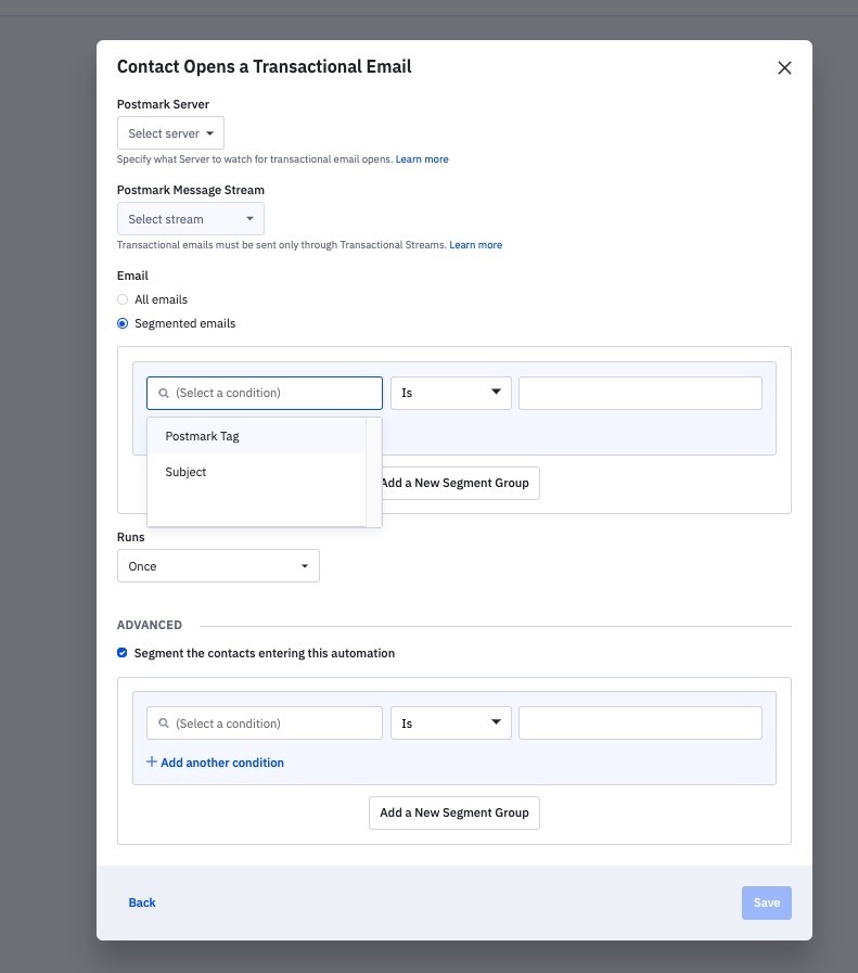 When you first select the Opens/Reads email trigger, you will need to click the blue Connect Postmark button to connect your ActiveCampaign and Postmark accounts using Oauth.
