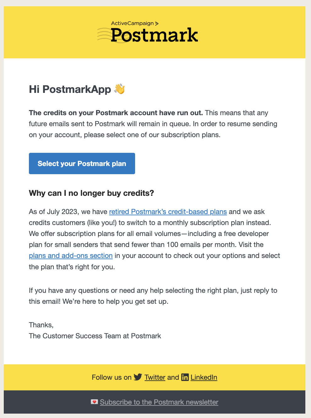 As of July 5, 2023, you'll no longer be able to buy credits, and credits will no longer auto-renew. When your credits run out, we'll ask you to switch to a monthly subscription to continue sending with Postmark. Read more about the retirement of the credit-based system.Â