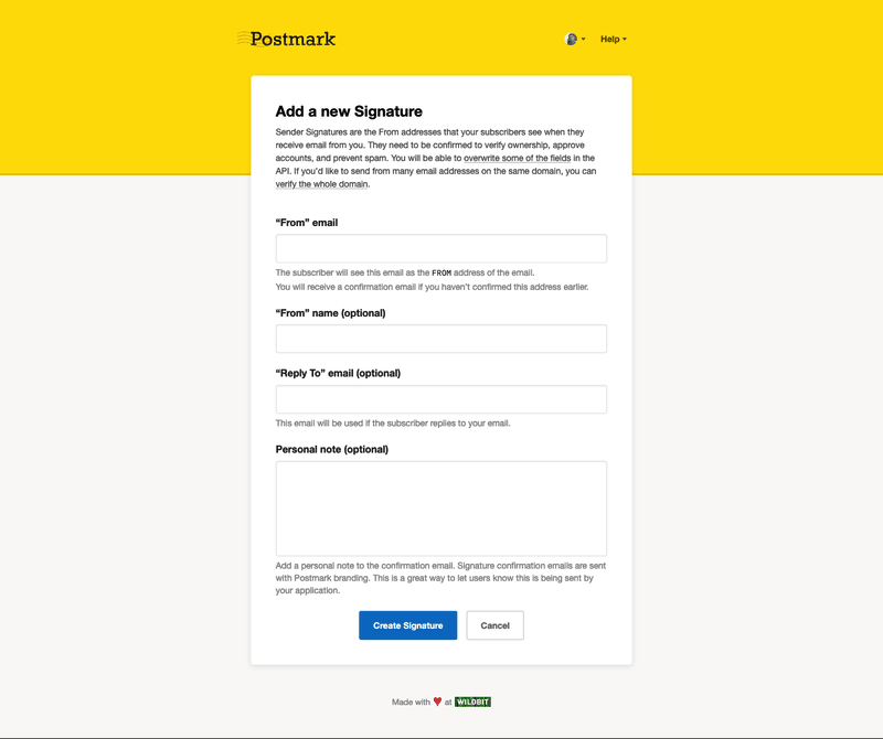 Postmark also allows for the addition of a Personal note for Sender Signature emails, this is a field to provide context to the recipient of what the confirmation email is for. This field is helpful if you're sending on behalf of a customer, and is available via our API or UI when adding a Sender Signature.