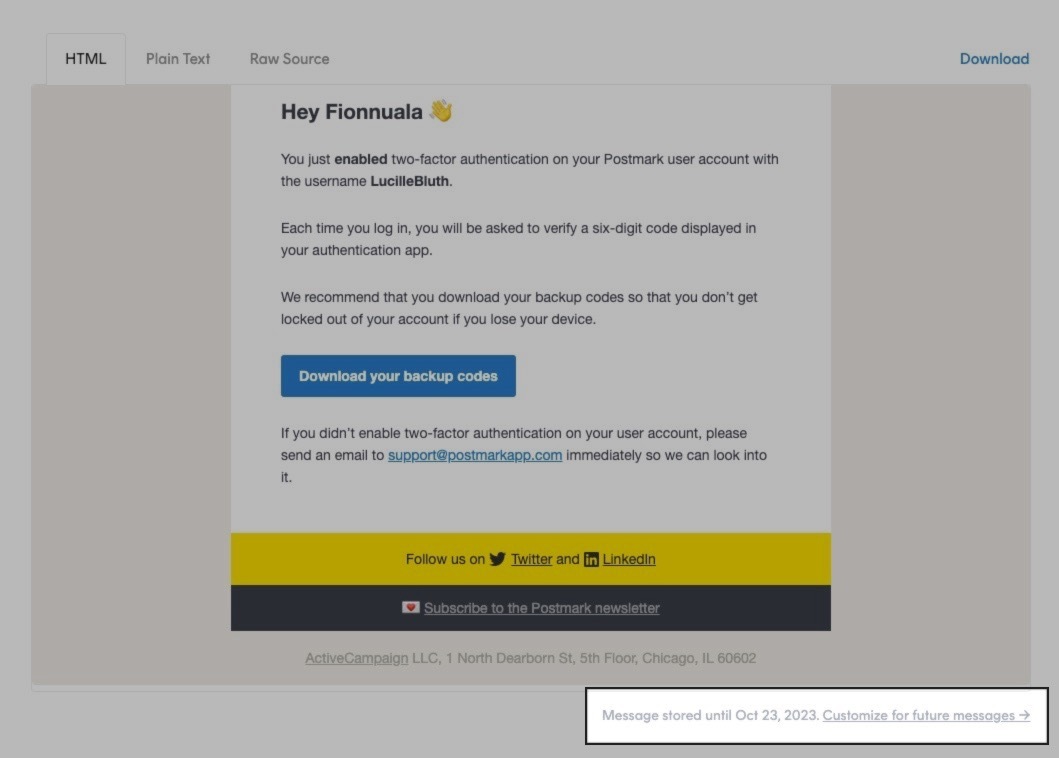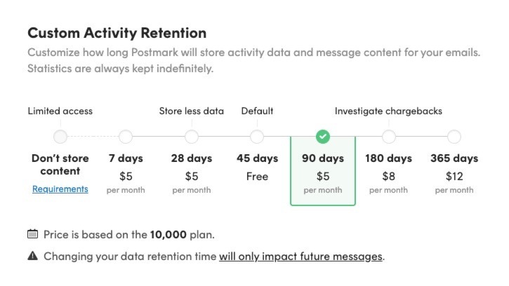 Postmark will store the activity data (such as delivery, open, click, and bounced events) and message content of your emails for 45 days by default. With our Retention Add-on, you can easily adjust the retention time from 7 to 365 days, depending on your needs.
