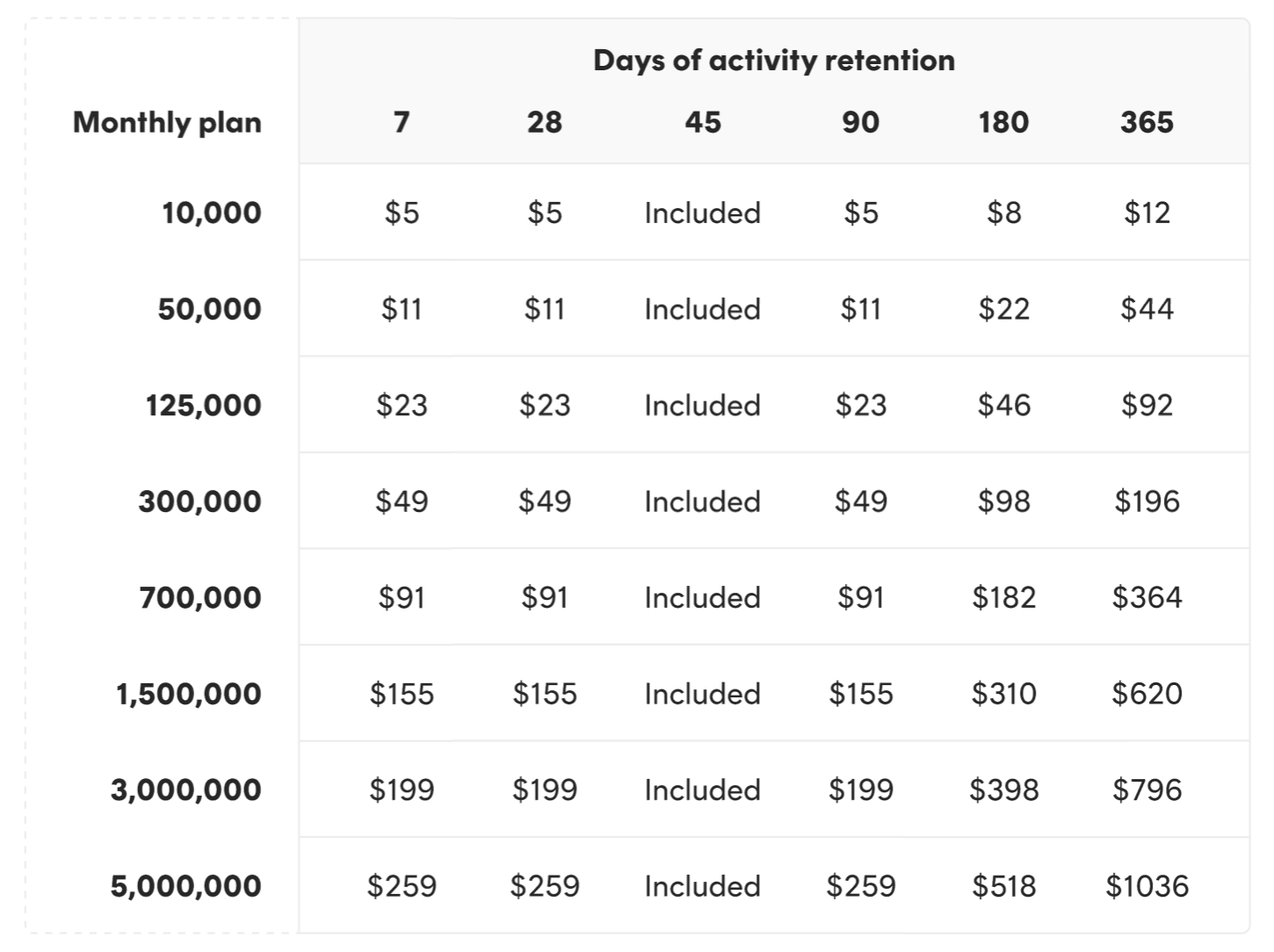 The price for custom activity retention depends on both your monthly base plan and the time you’d like us to keep your data. Here’s an overview of our pricing for all the combinations available today:Â