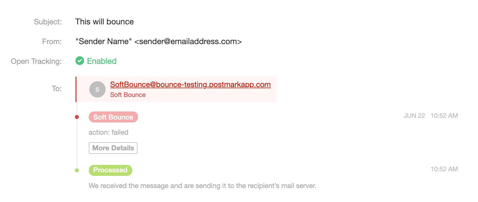 You can also trigger fake soft bounces (softbounce@bounce-testing.postmarkapp.com), ISP blocks (blocked@bounce-testing.postmarkapp.com), spam notifications (spamnotification@bounce-testing.postmarkapp.com), and more.